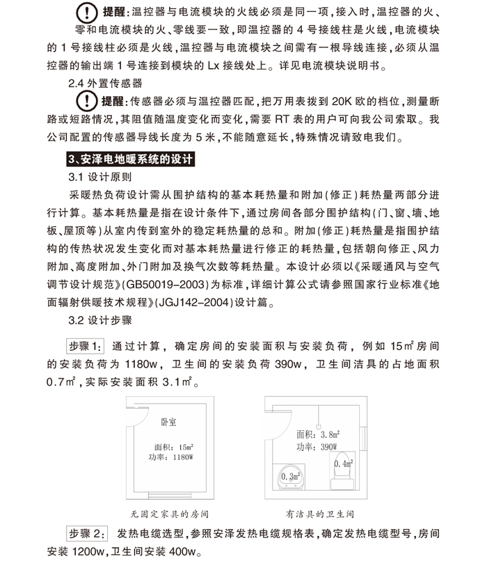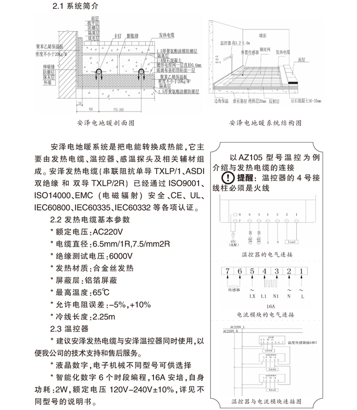 注:安泽电工发热电缆设计电压为:220V,标准长度为发热区尺寸,导线尺寸为2.25M,印字参见示例3100W。