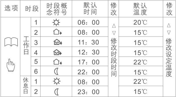 1)工作日的3与4时段的出厂默认温度值与2时段相同(这等同与4时段),请在必要时,修改此默认温度。