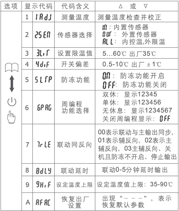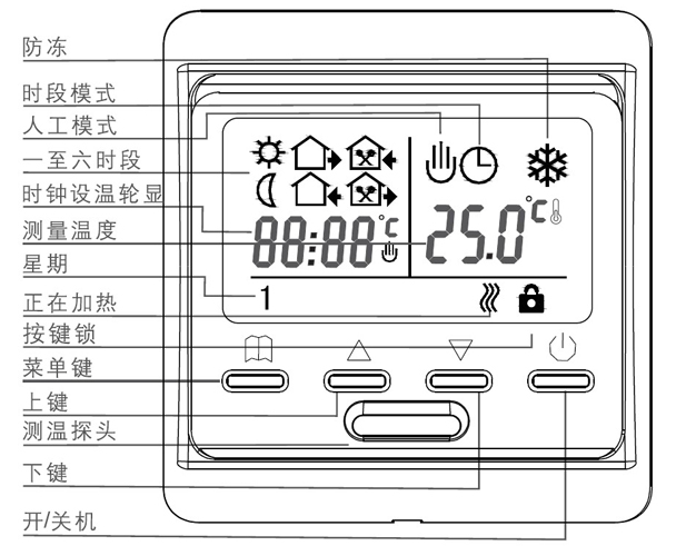 请正确选择内、外传感器工作方式,如选择出错或传感器故障(损坏),液晶界面将出现ER0或ER1,分别代表内置或外置传感器故障。温控器停止工作,直到故障被排除。