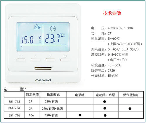 一周循环,每天可以设置六个时段与对应的设定温度的采暖房间温度控制器,并可以选择人工控制或临时控制的运行模式。适用于电采暖的电热设备控制与水系统采暖的电驱动阀门控制。